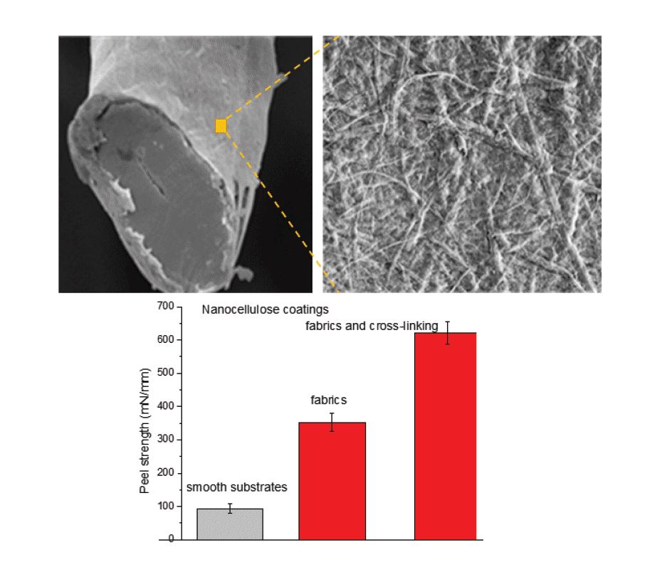 Renewable nanocellulose materials received increased attention owing to their small dimensions, high specific surface area, high mechanical characteristics, biocompatibility, and compostability. Nanocellulose coatings are among many interesting applications of these materials to functionalize different by composition and structure surfaces, including plastics, polymer coatings, and textiles with broader applications from food packaging to smart textiles. Variations in porosity and thickness of nanocellulose coatings are used to adjust a load of functional molecules and particles into the coatings, their permeability, and filtration properties. Mechanical stability of nanocellulose coatings in a wet and dry state are critical characteristics for many applications. In this work, nanofibrillated and nanocrystalline cellulose coatings deposited on the surface of polymer films and textiles made of cellulose, polyester, and nylon are studied using atomic force microscopy, ellipsometry, and T-peel adhesion tests. Methods to improve coatings adhesion and stability using physical and chemical cross-linking with added polymers and polycarboxylic acids are analyzed in this study. The paper reports on the effect of the substrate structure and ability of nanocellulose particles to intercalate into the substrate on the coating adhesion.