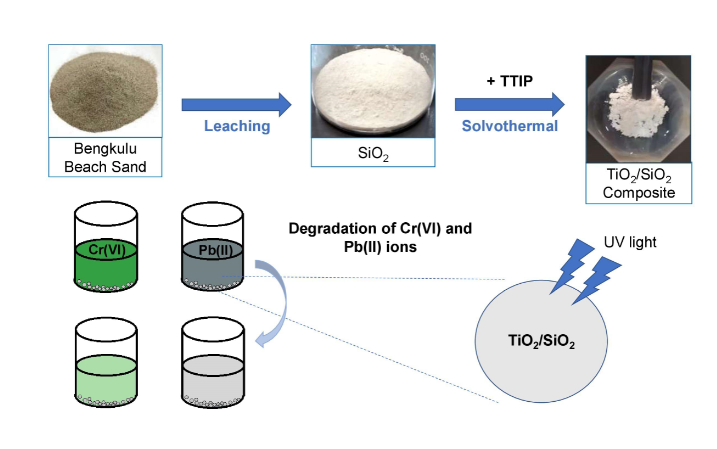 Heavy metals are non-biodegradable and have a high toxicity effect to living things which makes their presence in the environment extremely dangerous. The method of handling heavy metals waste by photocatalysis techniques using TiO2/SiO2 composite showed a good performance in reducing harmful pollutants. In this study, SiO2 from Bengkulu beach sand was used as a support material for TiO2 photocatalyst to reduce Cr(VI) and Pb(II) concentrations. SiO2 was obtained through leaching techniques using NaOH as a solvent. The TiO2/SiO2 composite photocatalyst were synthesized using a solvothermal method at 130 °C and then characterized using XRD, FTIR, SEM and PSA. Based on the XRD diffractogram, the synthesized TiO2 showed the anatase structure while the SiO2 showed the amorphous structure. Ti-O-Si bond is defined in the IR spectra, which indicates that the relationship between TiO2 and SiO2 is a chemical interaction. The results of SEM and PSA characterizations show agglomerated spherical (round) particles with a mean particle size of 616.9 nm. The TiO2/SiO2 composite of 7:1 ratio showed the highest photocatalytic activity after 180 minutes of UV irradiation, with a concentration-decrease percentage of 93.77% and 93.55% for for Cr(VI) and Pb(II), respectively.