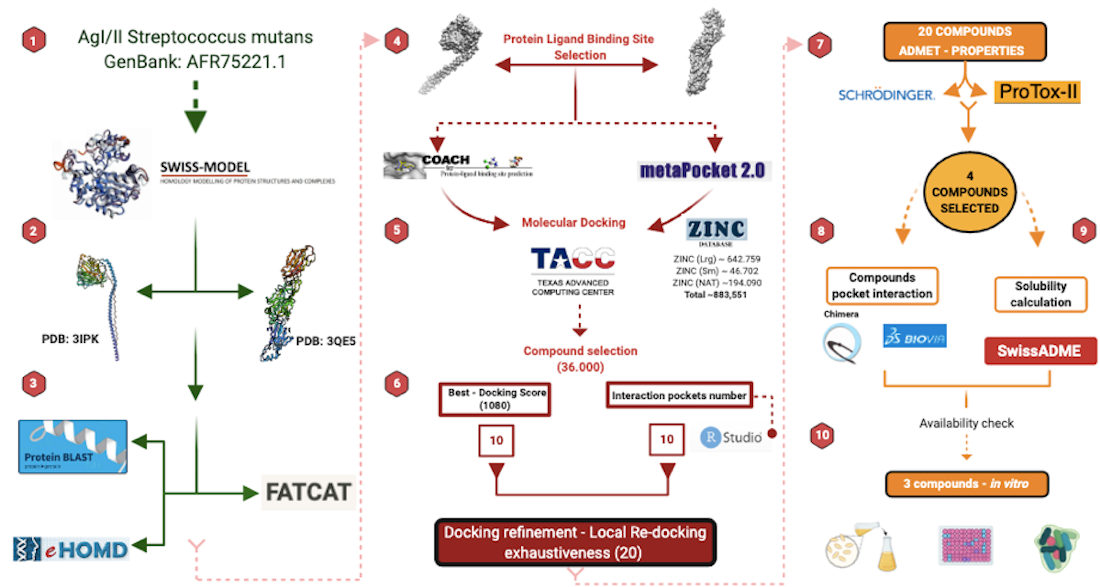 Streptococcus mutans is well known for having virulence factors associated with its cariogenic role, such as glucosyltransferases, which have been used as targets for the virtual screening of molecules with inhibitory capacity. The Antigen I/II of S. mutans is involved in the adhesion to the surface of the tooth and the bacterial co-aggregation in the biofilm formation, despite that, this protein has not been used as a target in a virtual strategy search for inhibitors. In this study we identified in silico and evaluated in vitro molecules with adhesion inhibitory potential on S. mutans Ag I/II. A virtual screening of 883,551 molecules was conducted, cytotoxicity analysis on fibroblast cells, S. mutans adhesion studies, scanning electron microscopy analysis for bacterial integrity, and molecular dynamics simulation were also performed. We have found three molecules (ZI-187, ZI-939, ZI-906) that were not cytotoxic and inhibited the adhesion of S. mutans to polystyrene microplates. Molecular dynamic simulation by 300 nanoseconds showed stability of the interaction between ZI-187 and Ag I/II (PDB: 3IPK). This work provides three new molecules that targets Ag I/II and have the capacity to inhibit in vitro the S. mutans adhesion on polystyrene microplates and provides a new computational line for the search and selection of safe inhibitory molecules against different pathogens.