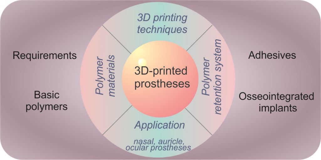 | PU | Thermoset, high elastic properties | FDM, SLS, casting in 3D-printed molds | Excellent flexibility, ability to external and internal staining, fine cosmetic results | Sensitivity to moisture, limited mechanical properties | Ocular prostheses, molds, skin-like coating | [63] [64] |