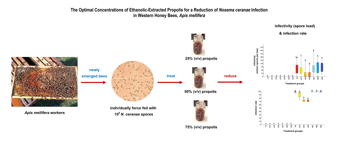 This study aimed to determine the propolis concentration that optimizes the control of N. ceranae infection in honey bee workers. We determined propolis efficacy by calculating the survival rate, infection rate (number of infected bees per non-infected bees for a hundred bees), and infectivity (number of N. ceranae spores per bee) of N. ceranae treated bees.