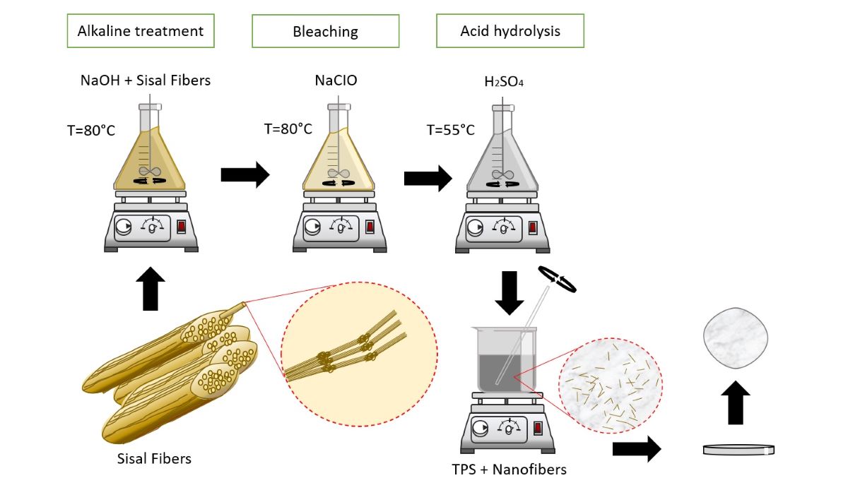 Thus, the objectives of this study were to obtain sisal nanofibers using sulfuric acid at a concentration lower than that of conventional treatments (ranging from 60 to 65%), to produce corn starch films and to evaluate the behaviors of the nanofibers as reinforcing agents at different concentrations to evaluate their influences on the mechanical performance levels of the material produced.