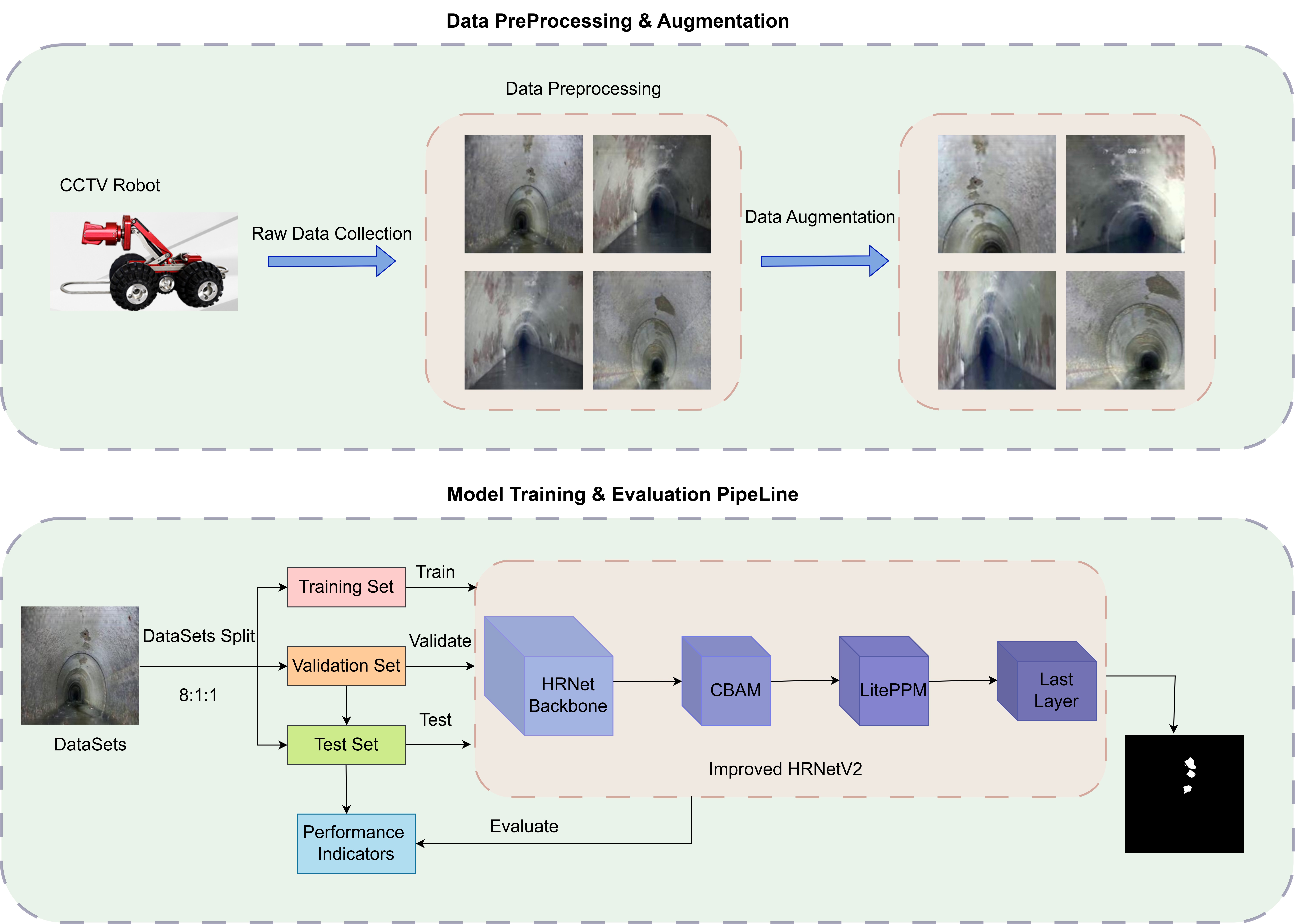 - Comprehensive experiments on a self-built drainage pipe defect dataset validate the effectiveness of the proposed approach. Results show that the model significantly outperforms mainstream U-Net variants and the original HRNetV2 in terms of segmentation accuracy (mIoU) and recall of small defects.
