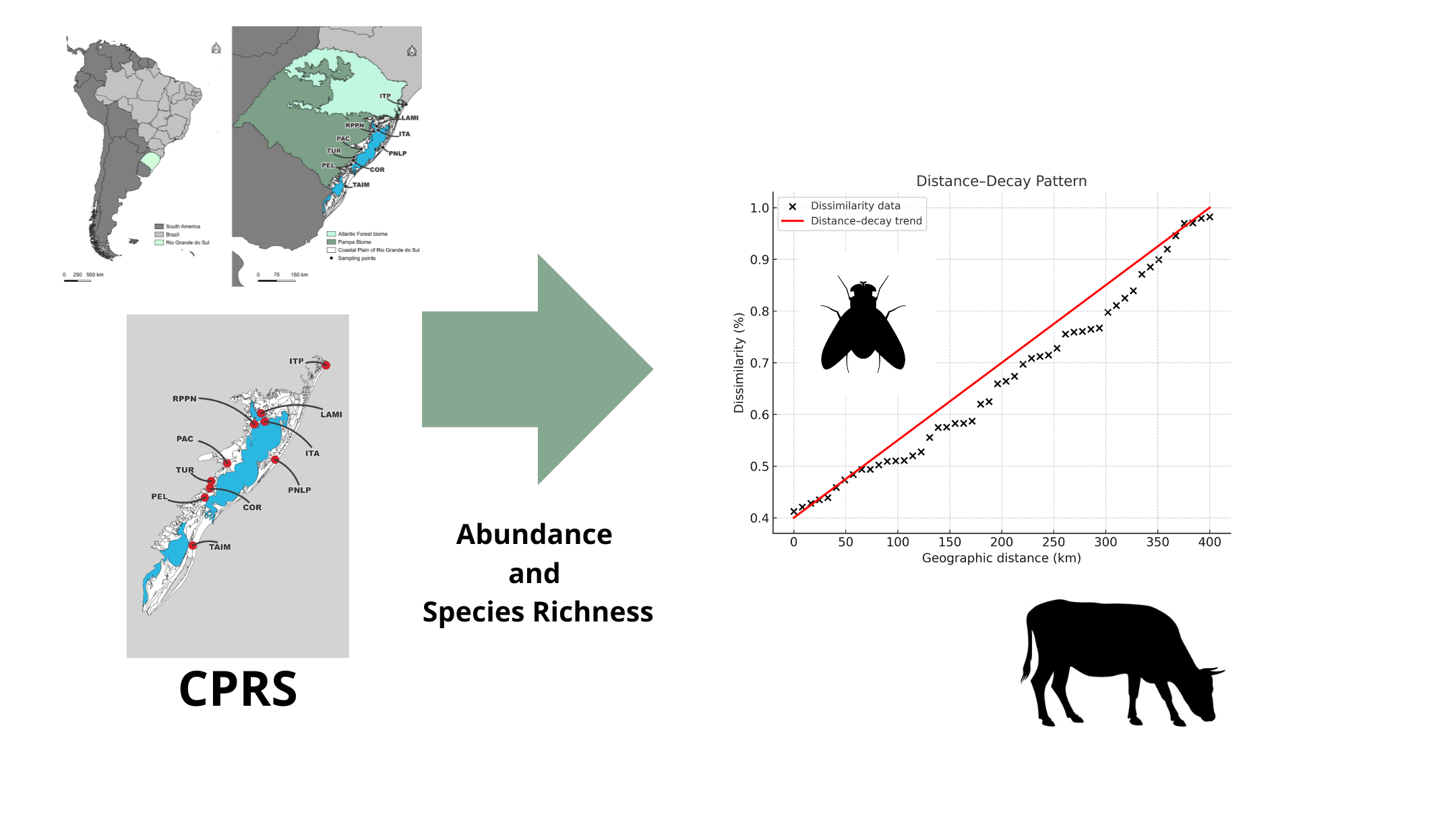 This study aims to investigate how geographic distance influences the similarity and diversity of Tabanidae communities in the Coastal Plain of Rio Grande do Sul. It also assesses how habitat fragmentation contributes to the structuring of these communities.