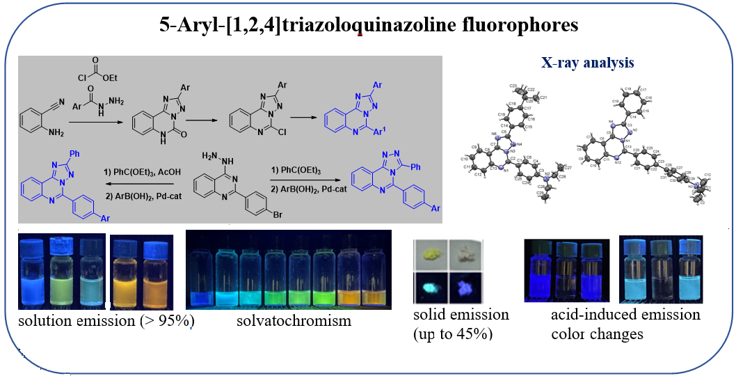 5-(4-Diphenylaminophenyl)-2-phenyl-[1,2,4]triazolo[1,5-c]quinazoline (6b). The general procedure was applied using 5-chloro-2-phenyl-[1,2,4]triazolo[1,5-c]quinazoline 5a and 4-(diphenylamino)phenylboronyc acid as the starting materials. Reaction time is 14 h. Column chromatography: SiO2, hexane and CH2Cl2 (7:3) and then EtOAc and hexane (1:9). Pale-yellow solid, yield: 58% (150 mg); mp = 191–193 °C; 1H NMR (CDCl3, 400 MHz) δ 7.13–7.16 (2H, m, Phenyl), 7.21–7.24 (6H, m, Phenyl, H-3’’, H-5’’), 7.33–7.37 (4H, m, Phenyl), 7.51–7.53 (3H, m, H-3’, H-4’, H-5’), 7.66–7.70 (1H, m, H-8), 7.81–7.84 (1Н, H-9), 8.08 (1H, d, 3J = 8.2, H-10), 8.38–8.44 (2H, m, H-2’, H-6’), 8.61–8.65 (3H, m, H-7, H-2’’, H-6’’); EIMS (m/z, Irel %): 490 [M+1]+ (39), 489 [M]+ (100), 488 (14), 77 (11); 13C {1H} NMR (CDCl3, 100 MHz) δ 117.2, 120.8, 123.9, 124.1, 124.4, 125.9, 127.8, 128.6, 128.8, 129.7, 130.5, 130.6, 131.9, 132.1, 143.3, 146.2, 147.0, 151.1, 153.2, 164.0; Exact mass for C33H23N5 (489.1953). Calcd: C, 80.96, H, 4.74, N, 14.30%. Found: C, 80.86, H, 4.87, N, 14.19%.