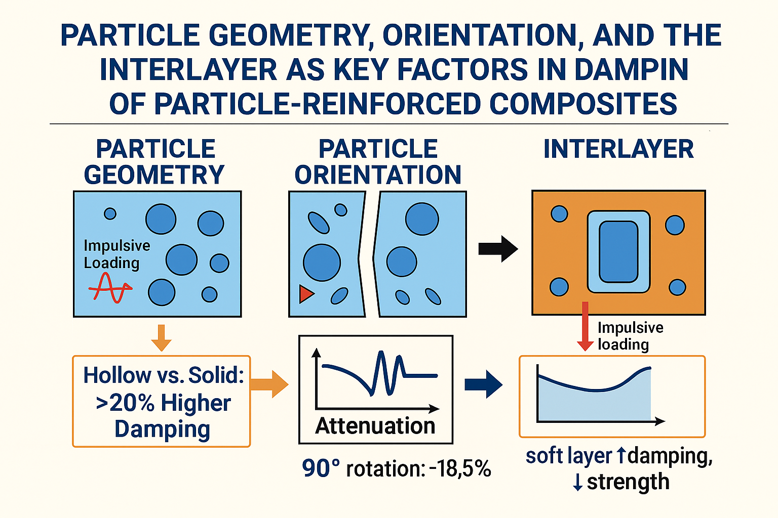 The findings of this study carry broader implications for the design and optimization of advanced composites. They clearly demonstrate that the performance of a composite cannot be assessed solely on the basis of the volume fraction of its constituents; rather, the internal microscale structural topology plays a decisive role in controlling its dynamic response. This insight aligns with current directions in multiscale modeling, which highlight the governing influence of micro- and nanostructures on macroscopic behavior. Consequently, rational design strategies for dynamically loaded components should integrate not only material composition but also the tailored engineering of particle geometry, orientation, and interfacial architecture. Such an approach opens new opportunities for enhancing damping efficiency while preserving structural integrity in next-generation composite systems