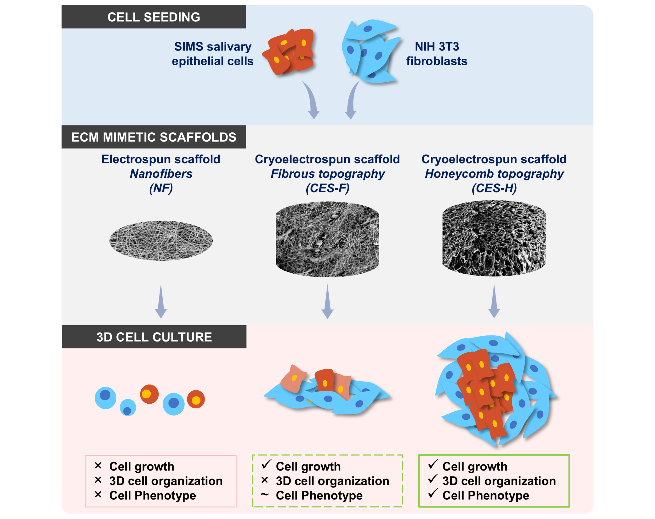 We previously developed 3D cryoelectrospun scaffolds (CES) with fibrous (CES-F) and honeycomb-like (CES-H) topographies and showed that CES-H mimics the porosity, pore size, and viscoelasticity of native salivary ECM [