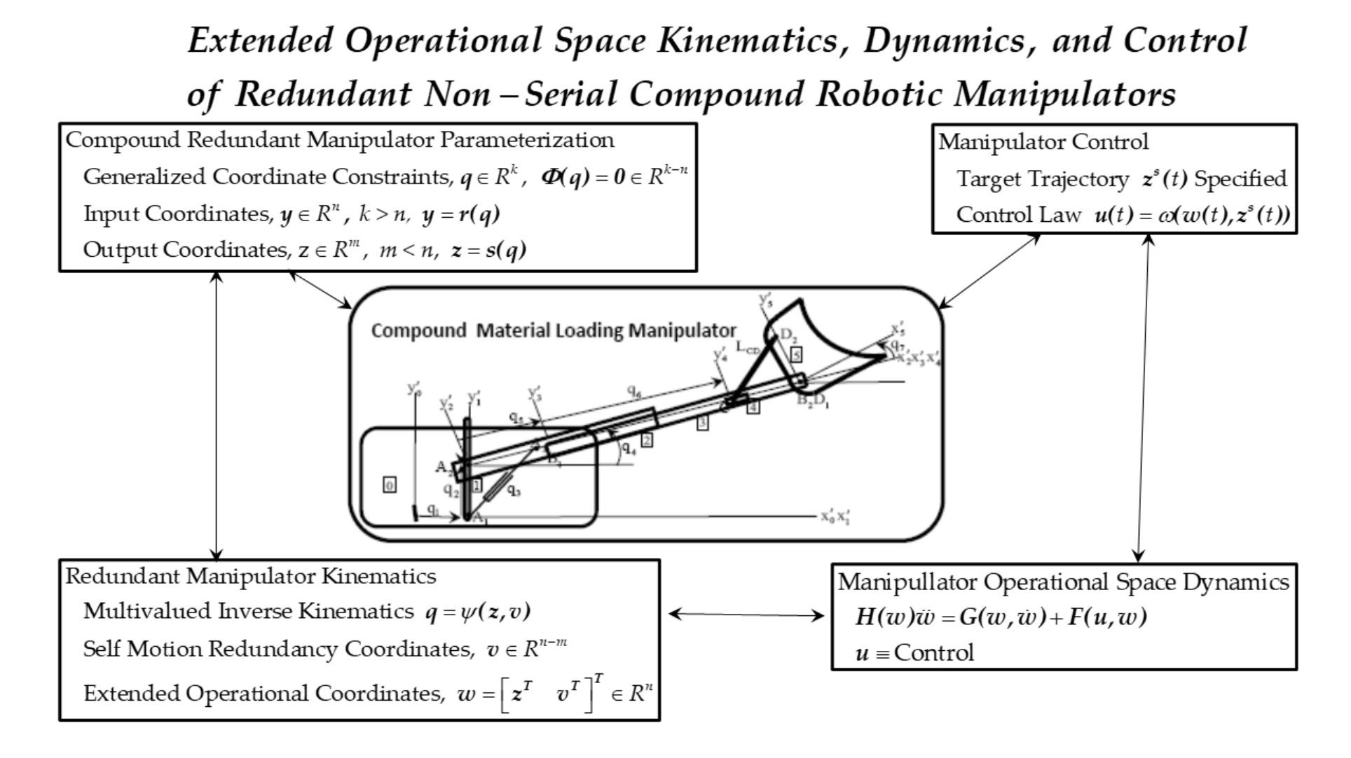 An extended operational space kinematics and dynamics formulation is presented for control of redundant non-serial compound robotic manipulators. A broad spectrum of high load capacity non-serial manipulators used in earth moving, material handling, and construction applications is addressed. Departing from conventional approaches that rely on Jacobian pseudoinverses and local null-space projections, a globally valid, differential geometry-based, multi-valued inverse kinematic mapping is defined at the configuration level, with explicit self-motion parameterization of manipulator redundancy. The formulation yields coupled second-order ordinary differential equations of manipulator dynamics on the product space of task variables and self-motion coordinates. This enables direct integration of system dynamics with control strategies, such as model predictive control or feedback design, while maintaining task constraint compliance. The methods presented are validated through simulation and control of a multi-degree of redundancy non-serial compound material loader manipulator, demonstrating advantages in generality, numerical accuracy, and trajectory smoothness.
