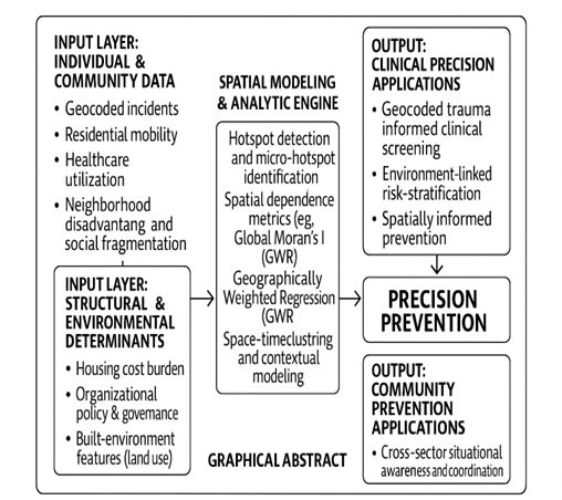 Background/Objectives: Geographic Information Systems (GIS) offer essential capabilities for identifying spatial concentrations of vulnerability and strengthening context-aware prevention efforts across healthcare and community systems. Interpersonal Violence (IPV) remains a critical public health challenge shaped by structural, ecological, and situational factors, but it represents only one of several preventable harms that benefit 24 from this spatially informed analysis. This manuscript presents a geospatial public health architecture designed to generate anticipatory, place-based risk forecasting applicable across diverse community and institutional environments. Methods: The framework integrates de-identified surveillance data, ecological indicators, environmental exposures, and temporal dynamics into a unified spatial epidemiology model. Multilevel data layers are geocoded, spatially matched, and analyzed using clustering, spatial dependence metrics, and contextual modeling to identify micro-environments of elevated vulnerability. Results: The model identifies spatial clustering, mobility-linked risk patterns, and emerging escalation zones using neighborhood disadvantage, built-environment factors, and situational markers. Spatial outputs support clinical applications such as geocoded trauma screening, risk-stratified decision support, and context-aware discharge planning. Community applications include targeted environmental interventions, cross-sector resource coordination, and equity-focused prevention planning. Conclusions: By merging behavioral theory, spatial epidemiology, and prevention science, this methodological model enhances anticipatory detection, strengthens trauma-informed practice, and supports coordinated public health response. It establishes a con- 41 ceptual foundation for future empirical research using high-resolution restricted datasets and advances spatially informed prevention across diverse settings, consequently promoting the continued development of dynamic, integrated equity-focused prevention systems.