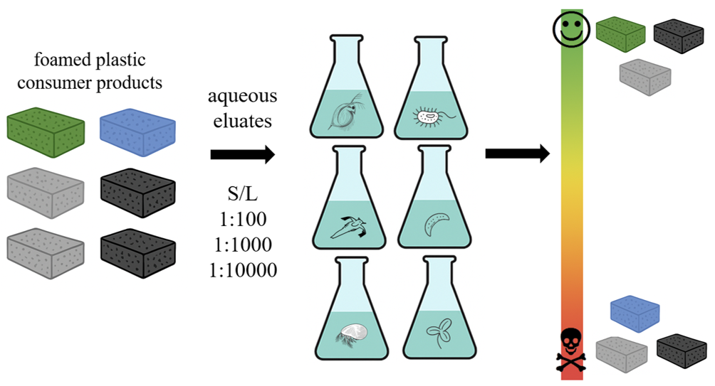 Plastic pollution is a global challenge. Despite plastics being complex chemical mixtures, hazard research has focused on particulate forms and the risks of plastics additives, especially for environmental organisms, remain poorly understood. This is a significant knowledge gap considering ubiquitous organismal exposure to plastics and the associated 16 000+ additives. The aim of this study was to provide ecotoxicological characterization of aqueous eluates of foamed plastic consumer products and propose a test battery for toxicity screening. For that, hazard of eluates of six randomly selected foamed plastic products was evaluated using aquatic decomposers, autotrophs and heterotrophs (Vibrio fischeri, Raphidocelis subcapitata, Lemna minor, Thamnocephalus platyurus, Heterocypris incongruens, Daphnia magna). Alarmingly, all plastic eluates affected the organisms, though toxicity varied among materials and species. Results showed that short-term contact may underestimate plastic eluate toxicity. To increase environmental relevance of hazard assessment of foamed plastic eluates, harmonizing leachate preparation, using natural water and avoiding (excessive) filtration of eluates should be considered. OECD/ISO assays with R. subcapitata, H. incongruens and D. magna (96 h) can be recommended as a minimal sensitive battery for effective screening of plastic eluate toxicity.