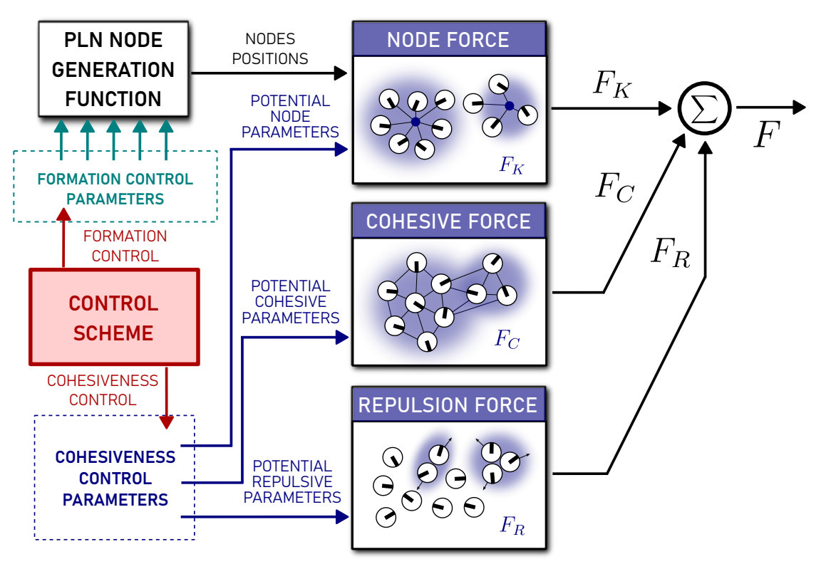 Accurately modeling and representing the collective dynamics of large-scale robotic systems remains one of the fundamental challenges in swarm robotics. Within the context of agricultural robotics, swarm-based coordination schemes enable scalable and adaptive control of multi-robot teams performing tasks such as crop monitoring, precision spraying, and autonomous field maintenance. For these applications, efficient modeling of both individual and collective robot dynamics is essential to achieve effective swarm coordination, ensuring an accurate representation of local interactions and emergent global behavior. This paper introduces a cohesive Potential Linked Nodes (PLN) framework, an adjustable formation structure that employs artificial potential fields (APFs) and virtual node-link interactions to regulate swarm cohesion and coordinated motion (CM). The proposed model governs swarm formation, modulates structural integrity, and enhances responsiveness to external perturbations such as uneven terrain and crop-induced obstacles. By interconnecting agricultural robots through a dynamically reconfigurable node-link topology, the PLN framework ensures decentralized stability while maintaining high cohesion and adaptability. The system’s tunable parameters enable online adjustment of inter-agent coupling strength and formation rigidity, allowing the swarm to adapt its configuration to varying environmental and operational constraints. Comprehensive simulation experiments were conducted to assess the performance of the cohesive PLN model under multiple swarm conditions, including static aggregation and dynamic flocking behavior using differential-drive mobile robots. Additional tests within a simulated cropping environment were performed to evaluate the framework’s stability and cohesiveness under realistic agricultural constraints. Swarm cohesion and formation stability were quantitatively analyzed using density-based and inter-robot distance metrics. The experimental results demonstrate that the PLN model effectively maintains formation integrity and cohesive stability throughout all scenarios, achieving coordinated coverage and motion adaptability suitable for precision agriculture applications.