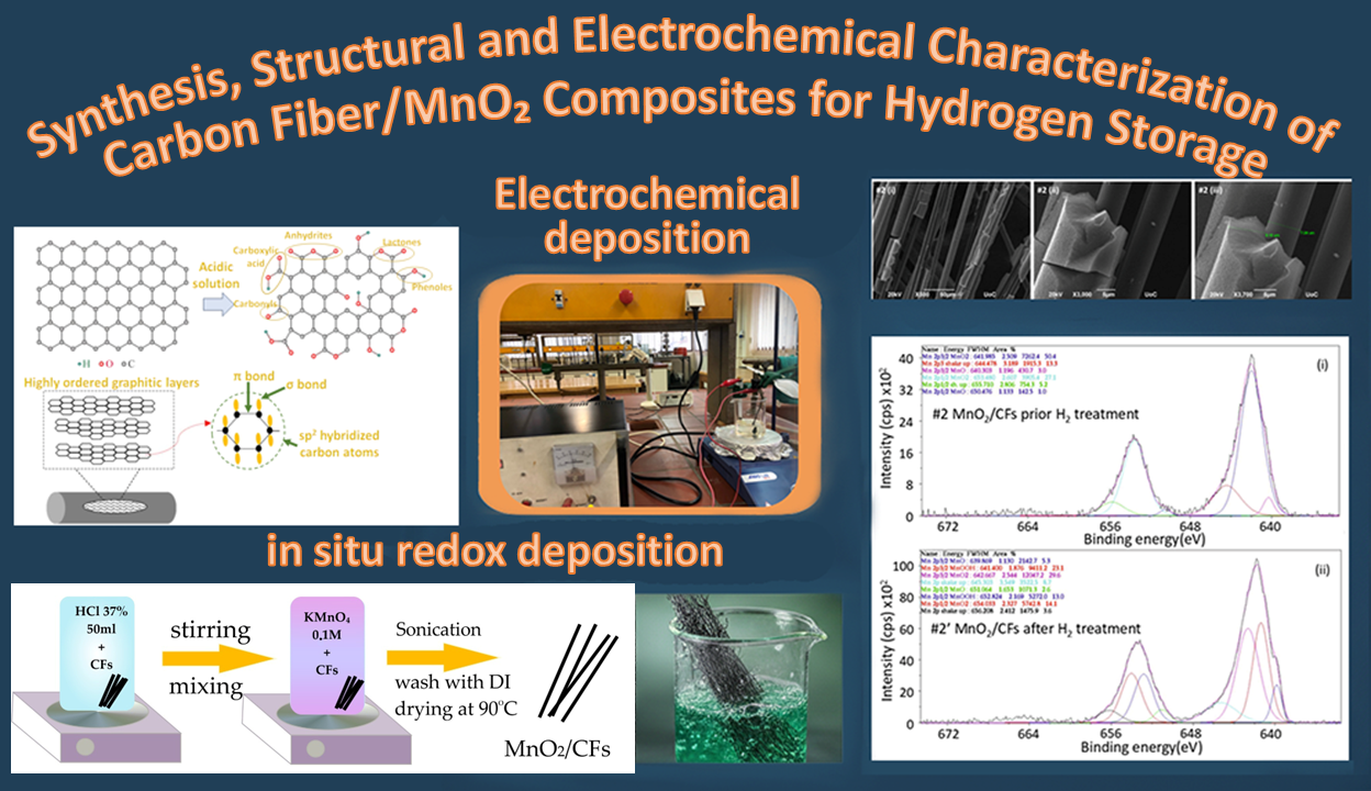 Hydrogen, as an alternative energy carrier, presents significant prospects for the transition to more environmentally friendly energy solutions. However, its efficient and safe storage remains a challenge, as materials with high adsorbent capacity and long-term storage capability are required. This study focuses on the synthesis and characterization of a composite material consisting of carbon fiber and manganese dioxide (MnO2/CFs), for the purpose of storing hydrogen. Carbon fiber was chosen as the basis for the composition of the composite material due to its large active surface area and its excellent mechanical, thermal, and electrochemical properties. The deposition of MnO2 on the surface of carbon fibers took place through two different synthetic pathways: electrochemical deposition and chemical synthesis under different conditions. The electrochemical method allowed the development of oxide in more quantity, with optimized structural and chemical properties, while the chemical method had a more basic application but required more time to showcase same or less capacity performance. The elemental analysis of the electrochemically produced composites showcased an average of 40.60 wt% Mn presence, which is an indicator of the quantity of MnO2 on the surface responsible for hydrogen storage, while the chemically produced showcased an average of 4.21 wt% Mn presence. Manganese oxide’s high specific capacity and reversible redox reaction participation make it suitable for hydrogen storage applications. The obtained results of the hydrogenated samples through physicochemical characterization indicated the formation of the MnOOH intermediate. These findings may be remarked that carbon fiber/MnO2 composites are promising candidates for hydrogen storage technologies. Finally, the fabricated carbon fiber/MnO2 composites were applied successfully as working electrodes for analysis of [Fe(CN)6]3-/4- redox system in aqueous KCl solutions.