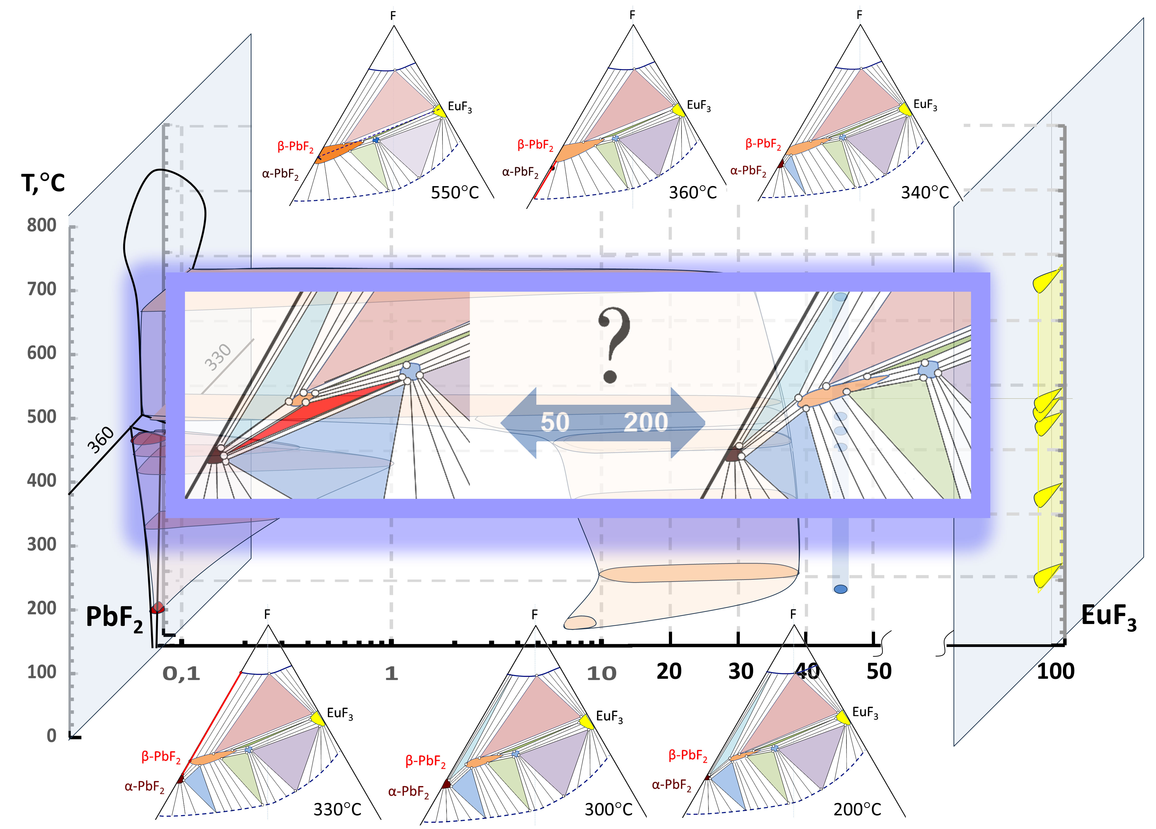A comprehensive study of the thermodynamic conditions (temperature, composition) of the existence of the cubic phase within the limits of homogeneity region in the quasi-binary PbF2-EuF3 system was carried out. Solid solution samples were obtained by solid-phase synthesis and co-precipitation technique from aqueous nitrate solutions. Phase equilibria were investigated in two regions: the solvus line in the range of 0-10 mol% EuF3 and the region of existence of the ordered rhombohedral R-phase in the range of 35-45 mol% EuF3. The structure of phases in the PbF2-EuF3 system was examined at temperatures below the phase transition temperature in lead fluoride (365°C). The possibility of obtaining a single-phase preparation of a cubic phase of high purity in 0-37 mol% EuF3 composition range has been demonstrated. The region of existence of the ordered rhombohedral R-phase in the concentration range from 37-39 to 43-44 mol% EuF3 was defined using X-ray phase analysis, optical probing, and Raman scattering.