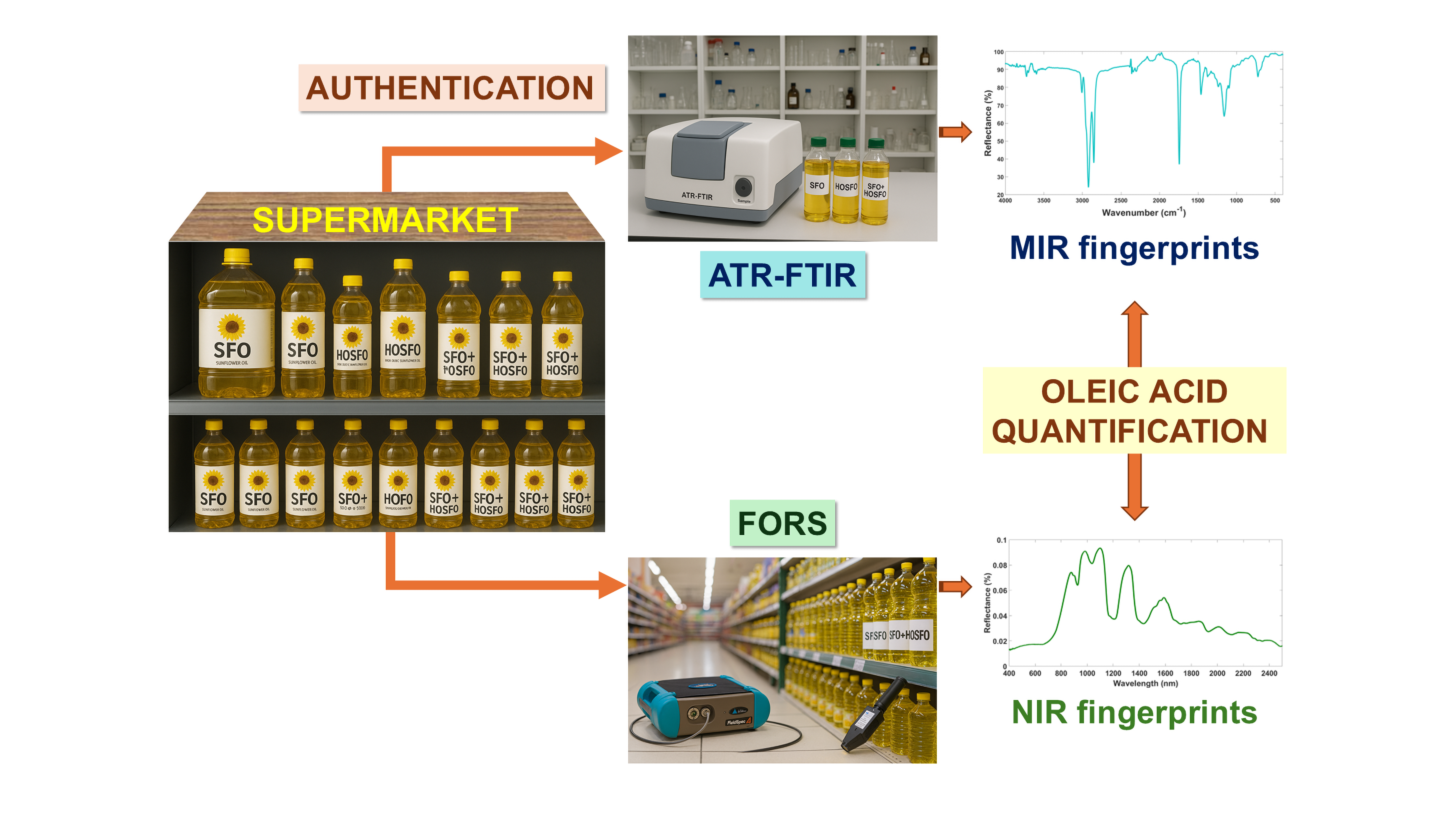 The composition of sunflower oil, rich in fatty acids, largely depends on the seed variety. Commercial sunflower oils are classified as low (SFO), medium (MOSFO), and high (HOSFO) oleic, distinguished by their oleic and linoleic acid content. Higher oleic acid levels enhance health benefits and oxidative stability. Due to their differing market values, ensuring the correct quality and authenticity of these oils is essential. Unsupervised chemometric methods have been applied to visualize the natural behaviour of sunflower oils while supervised models have been used for authentication based on Attenuated Total Reflection Fourier Transform Infrared Spectroscopy (ATR FTIR) fingerprints obtained from a benchtop spectrometer. Authentication of MOSFO is particularly challenging because of its wider oleic acid range (43.1 74.9%) and production via genetic modification or blending SFO/HOSFO. To address this, two multivariable PLS R regression models were developed using ATR FT IR and Fibre Optic Reflectance Spectroscopy (FORS) fingerprints, the latter obtained with a portable, cost-effective device. The results indicate that FORS could be used as a rapid quality control tool for on-site quantification. In contrast, ATR FT IR is a more accurate tool for confirmation and quantification, achieving excellent results (RPD = 7.09 and RER = 17.82).