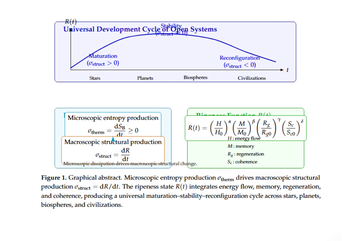 The study formalizes a ripeness function for four domains: stellar evolution, planetary habitability, biospheric stability, and civilizational dynamics. Each component is mapped to measurable proxies, such as stellar oscillation properties, crustal recycling rates, genomic redundancy, and institutional memory indices. From this, the paper derived falsifiable predictions that can be tested with current and upcoming missions and datasets, including space-based asteroseismology, ice-moon plume chemistry, paleogenomic reconstructions, and long-term social coherence indices.