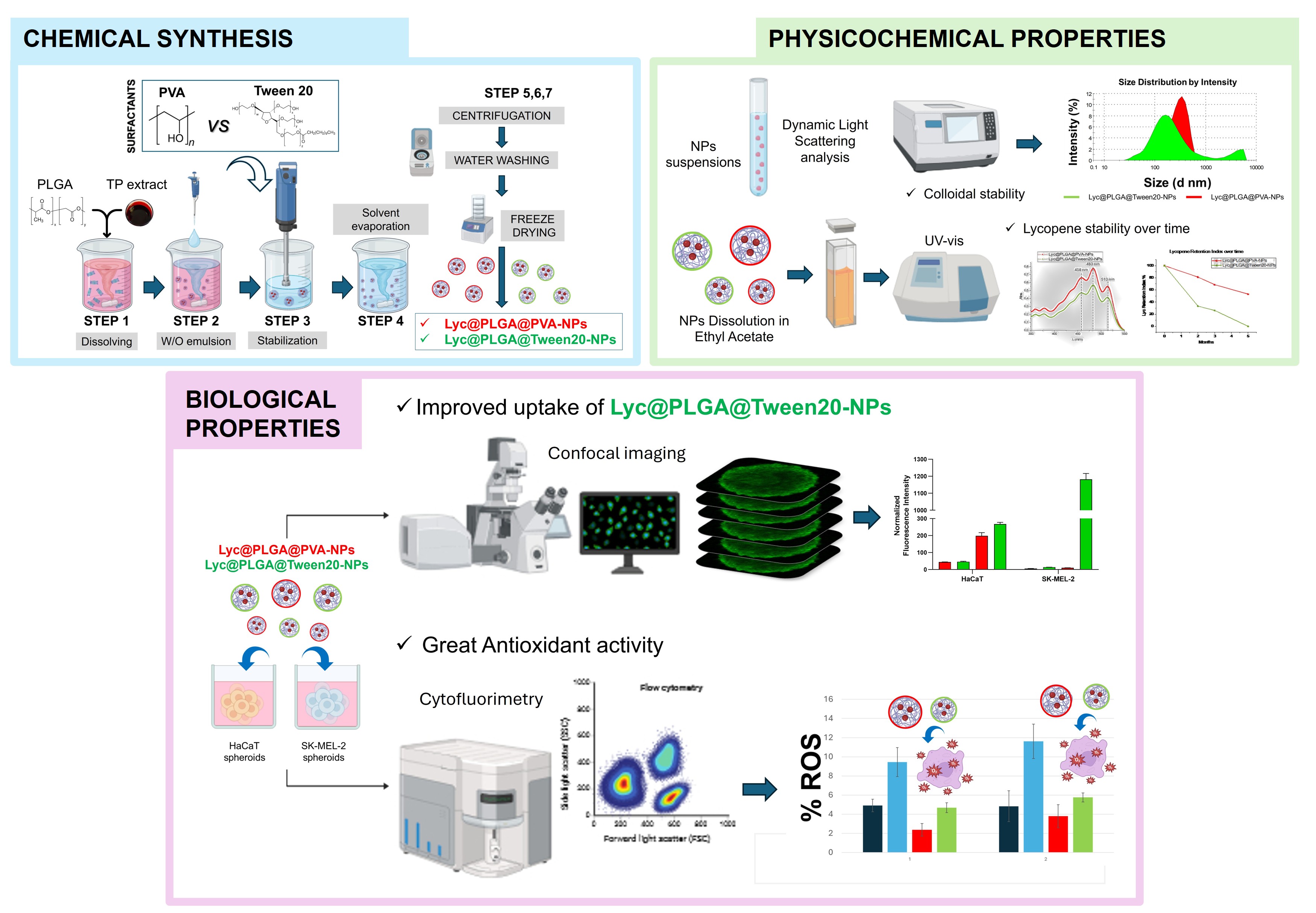 There is a growing demand for plant-derived antioxidants to replace synthetic ones in skincare applications. Phytochemicals are characterized by certain limitations, including poor bioavailability and chemical instability, which affect their industrial exploitation. Tomato peel extract has been used as a source of lycopene, which is renowned for its an-tioxidant properties. To improve the bioavailability of extracted lycopene, polymeric (Poly-lactic-co-glycolic acid) nano-carriers were synthesized by comparing two non-ionic surfactants, Polyvinyl alcohol and Tween 20. The impact of surfactants has been studied by evaluating: i) colloidal stability determined by Dynamic Light Scattering; ii) lycopene retention and bioactivity over time, as measured by spectrophotometric assays; iii) biolog-ical interactions on 2D and 3D culture keratinocytes and melanocytes cells. It was found that both surfactants enable the formation of stable lycopene-loaded nanoparticles sus-pensions; however, greater colloidal stability was exhibited by nanoparticles prepared with Tween 20. PVA, on the other hand, provided greater nanoparticles stability in terms of loaded lycopene retention and antioxidant activity. Tween 20 surfactant improves in-ternalization of lycopene-loaded nanoparticles in human skin spheroids. It was demon-strated that both surfactants provided excellent intracellular antioxidant activity of lyco-pene. This was observed in keratinocytes, melanocytes, adherent cells and spheroids, suggesting interesting skincare applications.