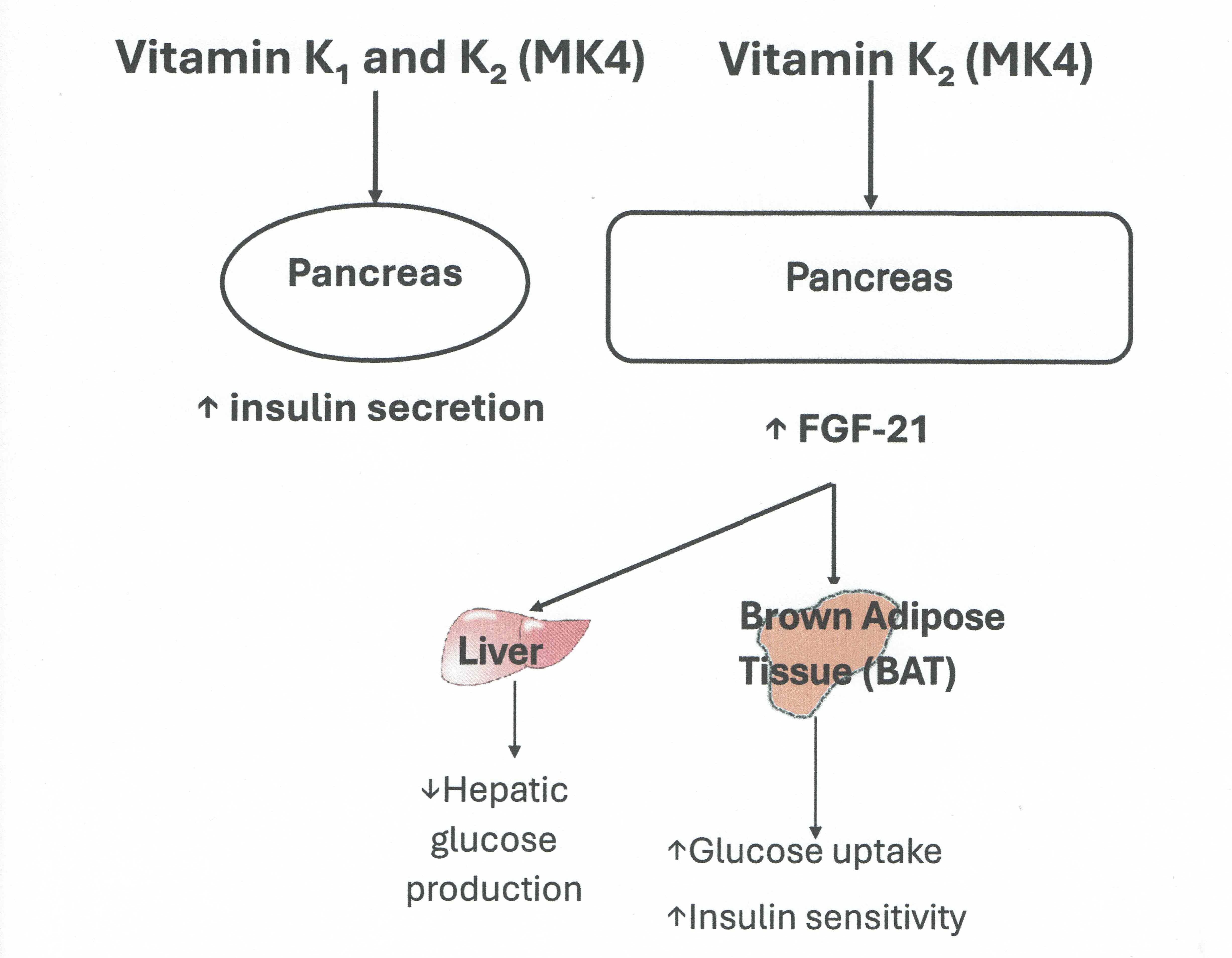Introduction: We hypothesised that vitamin K (VK) may have potential effect on insulin secretion and FGF-19 and FGF 21 may modulate the vitamin K/insulin pathway. We investigated whether vitamin K1 or K2 supplementation for 18 months can affect insulin secretion and FGF19 and FGF21 production. Methods: We conducted exploratory analyses using stored samples from an 18-month randomised double-blind placebo controlled trial of VK1 (1 mg/day) or VK2 (menaquinone-4, MK4 45 mg/day)) in 105 post-menopausal women with osteoporosis (PMO) aged between 55-85 years which looked at the effect of VK supplementation on bone mineral density. In the current study, plasma insulin (primary outcome), FGF19 and FGF21 (secondary outcomes) were measured at baseline, 6 and 18 months. Results: Plasma insulin at 6 and 18 months increased significantly compared to baseline value in both treatment arms (VK1 and VK2 (MK4) ) (Median Insulin [IQR] VK1: baseline : 41.2 [29.3, 54.3] pmol/L, 6 months: 59.7 [37.8, 89.5] pmol/L p<0.001, 18 months: 54.3[43.5, 73] pmol/L (p= 0.05), VK2 (MK4) arm (Median Insulin [IQR]: baseline: 44.3[30.6, 60.9], 6 months: 63.2[43.5, 97] pmol/L p=0.011, 18 months: 54.2[40.7, 103.5] pmol/L p=0.05) in within-group analyses. No significant changes were seen in the placebo group. Circulating FGF21 tended to be higher at 6 months (p=0.045) compared to baseline following VK2 (MK4) only. Conclusions: Improving VK status in post-menopausal women may improve insulin secretion. Our data suggest that MK4’s effect on the insulin axis may be mediated, at least in part, by FGF21. Further studies are needed for confirmation.