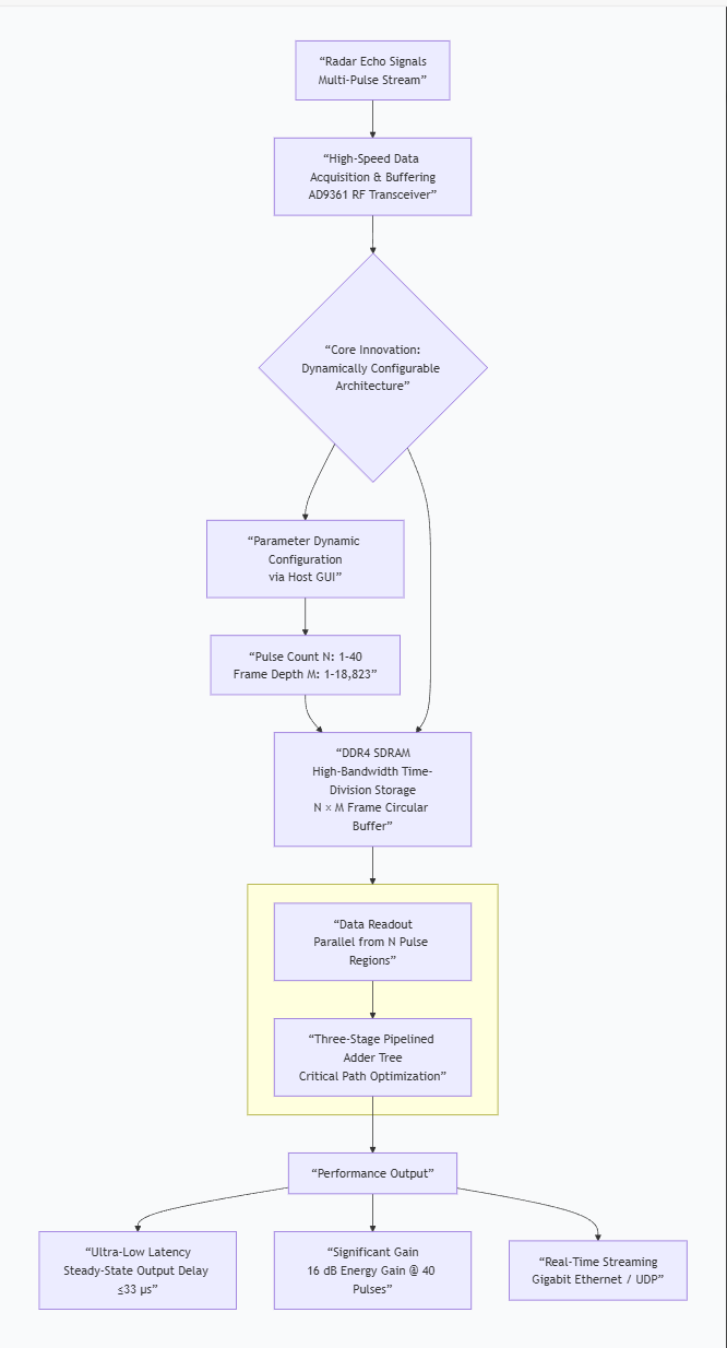 Radar signal coherent integration technology is a critical method to improve the performance of detection systems. However, existing techniques face challenges regarding real-time performance and the flexibility of multi-pulse coherent accumulation. In this paper, a dynamically configurable multi-pulse multi-frame real-time coherent integration system based on FPGA is designed and implemented, and the dynamic configuration of the number of pulses and the number of frames stored for each pulse is realized through the host computer. The experimental results show that the output signal delay of coherent integration is 33 microseconds at 40 pulses, and the energy gain reaches 16 dB at 40 pulses, which provides a dynamically configurable hardware platform and solution for real-time coherent integration of high-frame-count, multi-pulse radar signals.