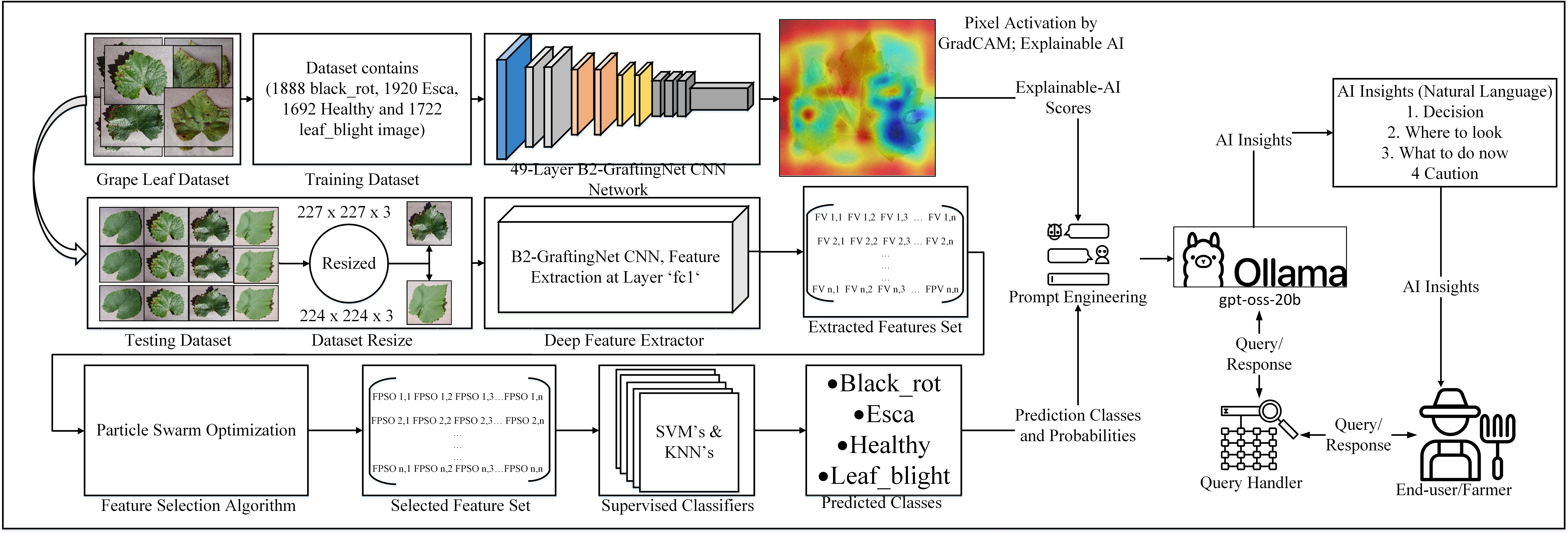 Owing to changing climatic and environmental conditions, plant diseases are becoming increasingly prevalent, posing a serious threat to global agriculture. Timely and accurate diagnosis remains challenging, especially where scouting still relies on manual inspection. We propose B2-GraftingNet, a deep learning framework for automated detection of grape leaf diseases. B2-GraftingNet is a streamlined variant of our earlier B4-GraftingNet, retaining its strengths while simplifying blocks for faster inference and deployment. The architecture combines a VGG16 backbone with Inception-style blocks inside a custom CNN to extract robust, multi-scale features based on color, size, and shape. To reduce redundancy and improve generalization, Binary Particle Swarm Optimization (BPSO) selects informative features prior to classification. We evaluate Support Vector Machines (SVM) and k-Nearest Neighbors (KNN); a cubic SVM attains 99.56% peak accuracy on the public Kaggle grape-leaf dataset. For context, we also benchmarked standard pretrained CNNs on the same data, observing validation accuracies of 34.04% (VGG16), 34.04% (VGG19), 97.95% (Xception), 94.91% (Darknet), and 98.44% (ResNet-50); B2-GraftingNet matches or exceeds these while remaining lighter and faster to train and deploy. To enhance transparency and actionability, we pair Grad-CAM, LIME, and occlusion-sensitivity visualizations with a local gpt-oss:20b assistant (served via Ollama) that converts evidence into plain, grower-focused guidance and supports interactive chat validated by horticulturists. Results are further checked against expert-annotated ground-truth labels, confirming high accuracy and computational efficiency. Overall, B2-GraftingNet offers a reliable, interpretable, and scalable solution for early grape-leaf disease detection. The complete setup (code, model, web platform, configuration, and assets) is available on Zenodo: https://doi.org/10.5281/zenodo.17353656.